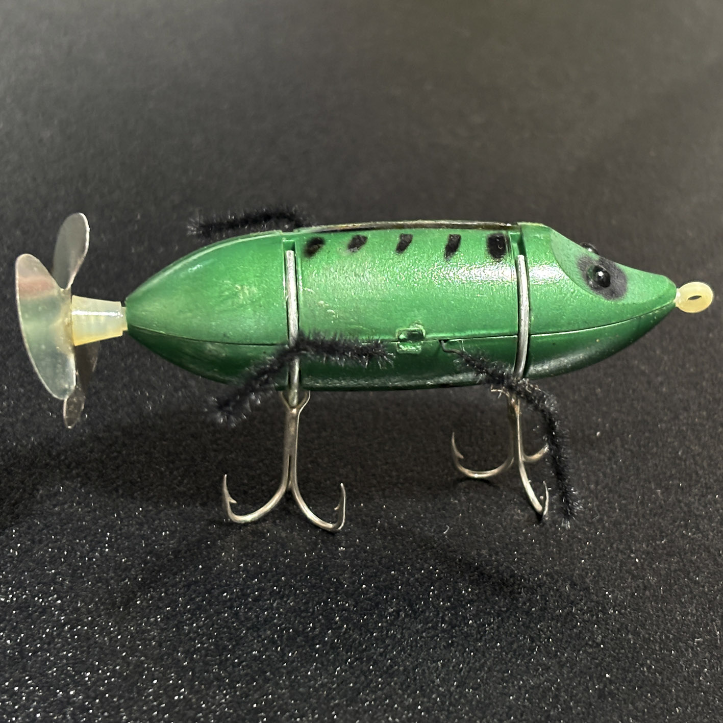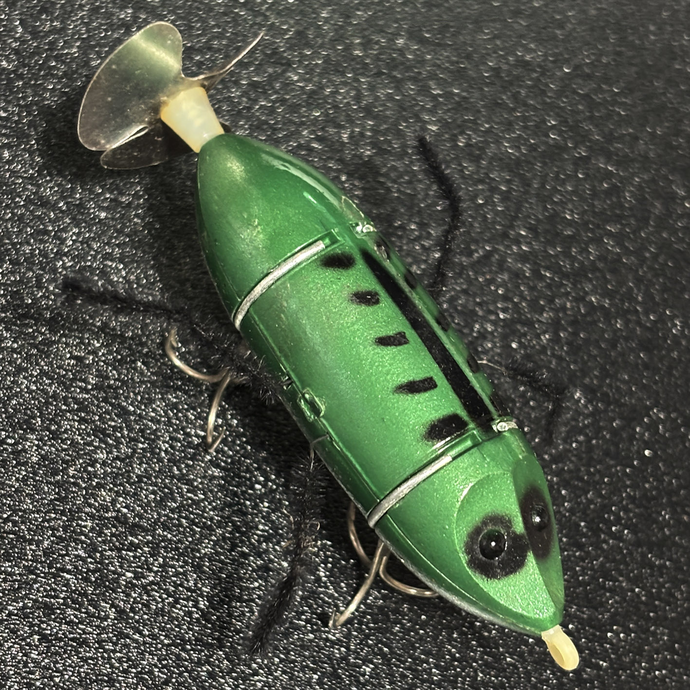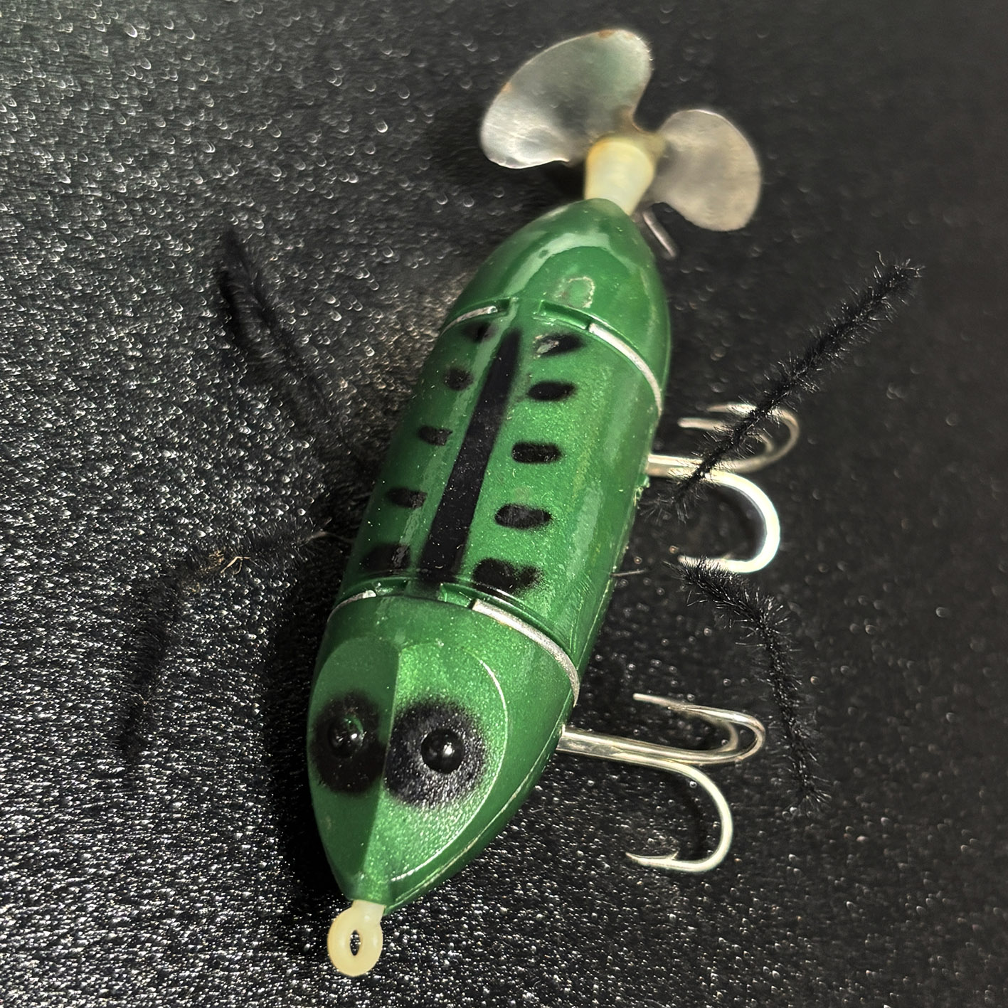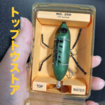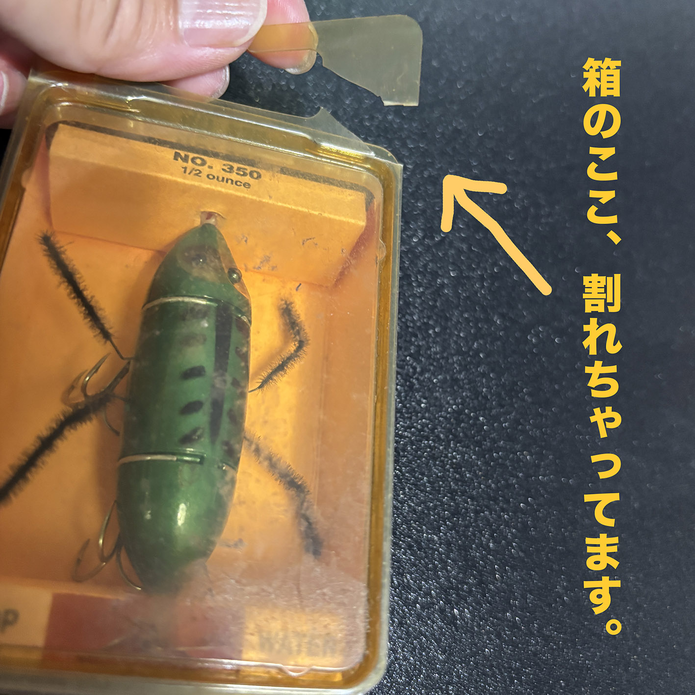僕はこのルアーが大好きで、トップトウストアではつねに売り続けたいと思っています。今回のこれは箱の一部が割れてしまっているものの箱入りで、中を見たかぎりでは恐らく未使用品なんじゃないかと思いますが、どうでしょう? 以前販売したクレイジーレッグスは後ろのペラが樹脂でしたが、これはアルミっぽい金属でできています。ひょっとしたらレア?