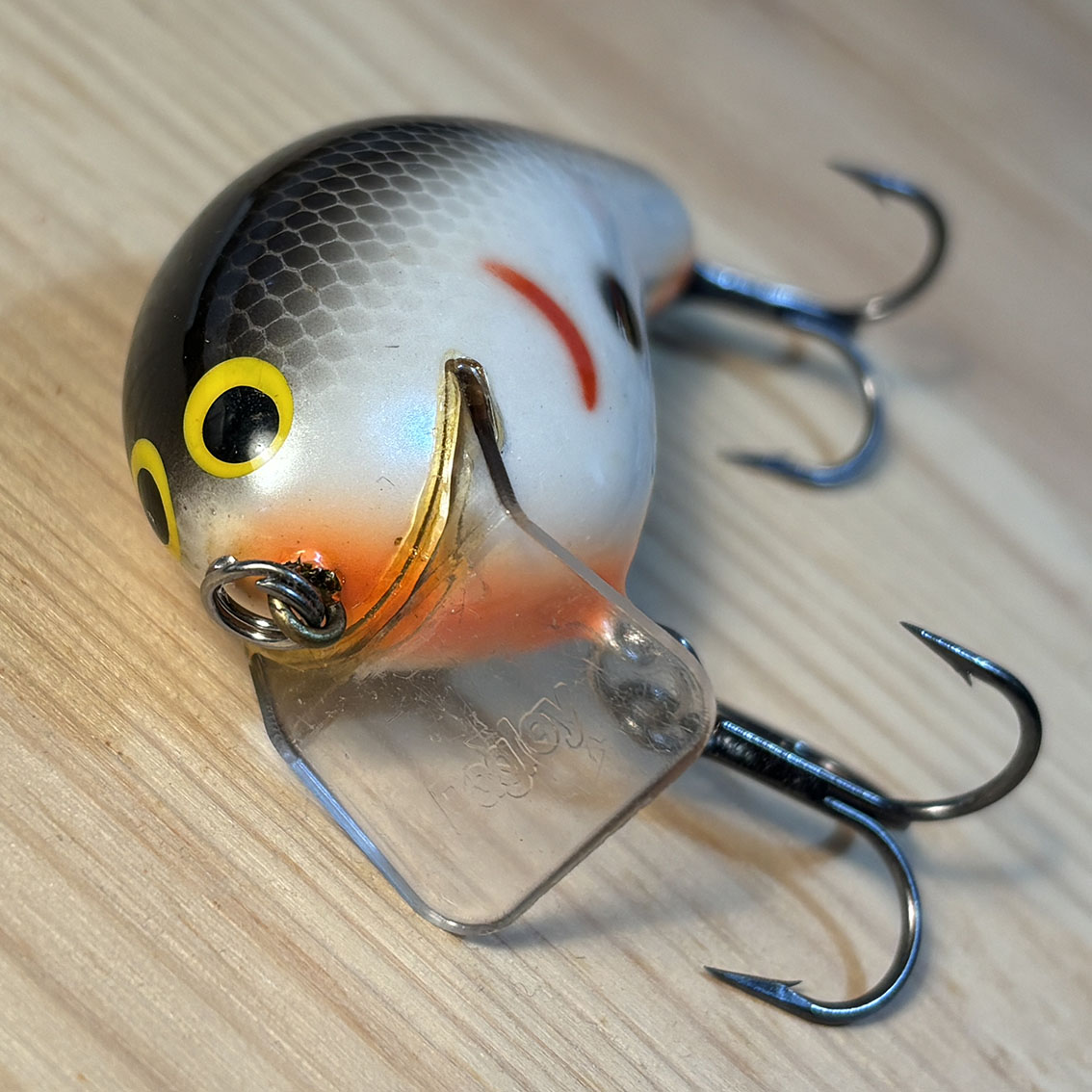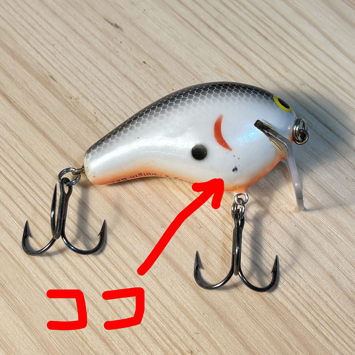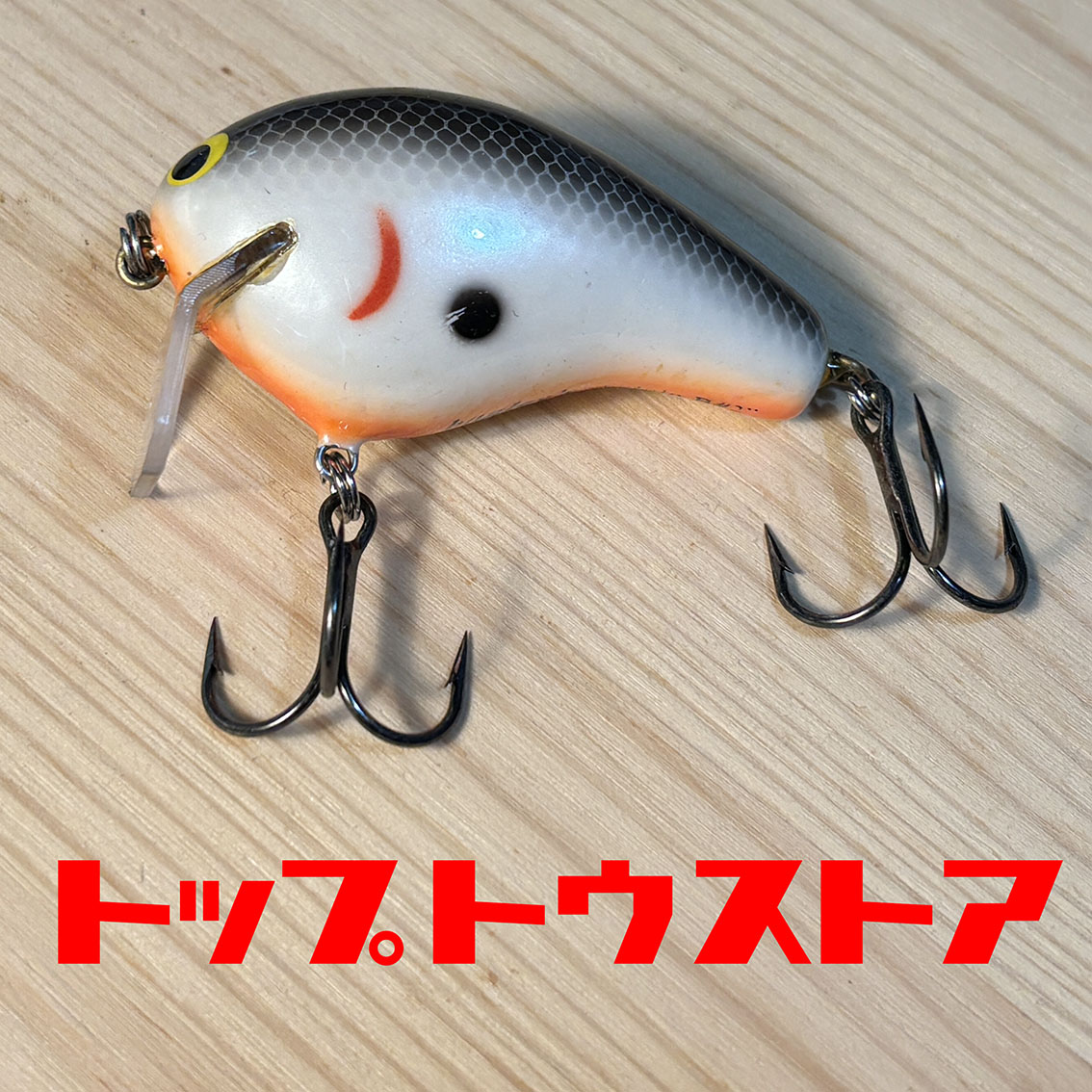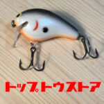 トップウォーターのバジングに特化したバグリーのブルジン。このバグリーらしさ全開のテネシーシャッドカラーといい、絶対に潜れない角度のリップといい、なんかこう清々しいルアーですね。顔もすっごく愛らしいし、コンディションはそんなに悪くないです。ベリーフックのアイの付け根にちょっとだけ亀裂が入ってますが、バグリーはバルサを圧縮して作られているのでわりとよくあることっぽいです。右サイドのエラ模様の下あたりにちょっとした塗装剥げみたいなのがありますが、傷的には浅いのでリペアなんかはしなくても大丈夫そうです。いいルアーだなぁこれ。