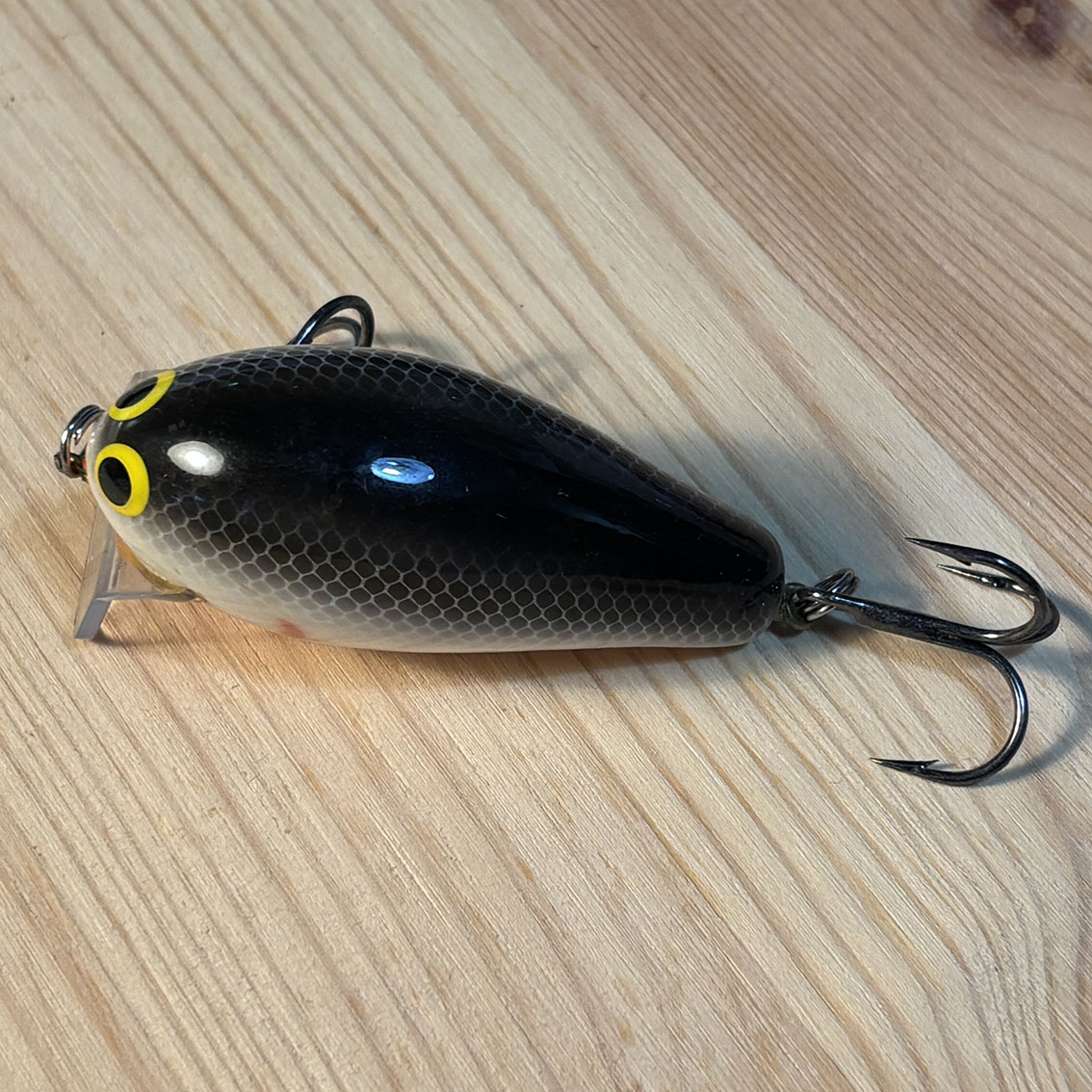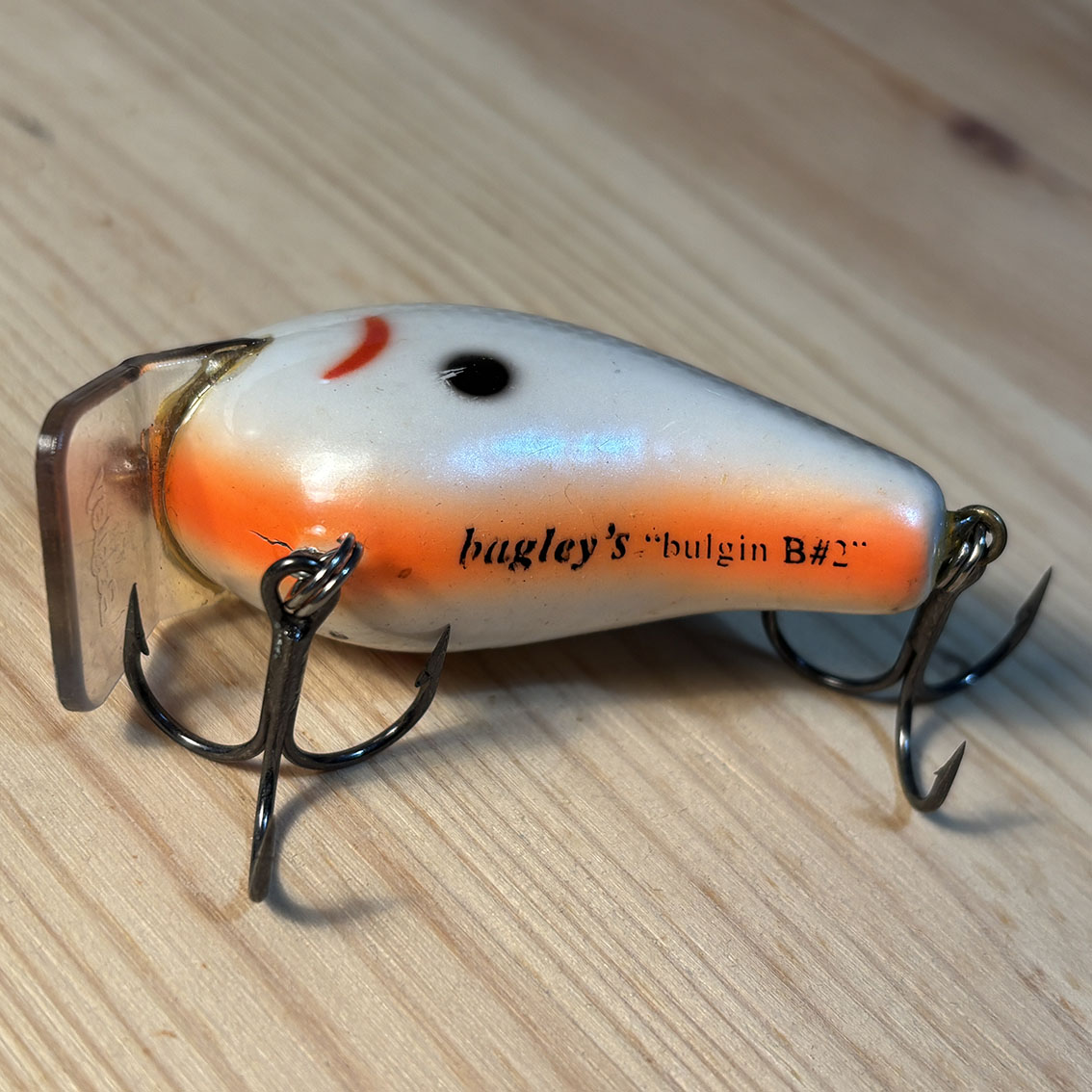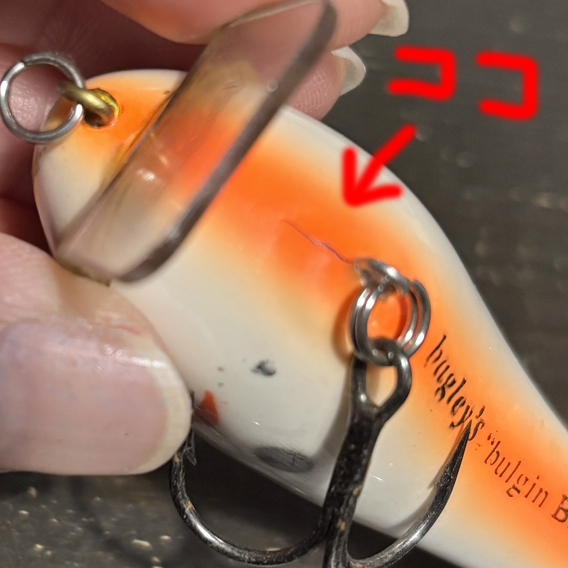 トップウォーターのバジングに特化したバグリーのブルジン。このバグリーらしさ全開のテネシーシャッドカラーといい、絶対に潜れない角度のリップといい、なんかこう清々しいルアーですね。顔もすっごく愛らしいし、コンディションはそんなに悪くないです。ベリーフックのアイの付け根にちょっとだけ亀裂が入ってますが、バグリーはバルサを圧縮して作られているのでわりとよくあることっぽいです。右サイドのエラ模様の下あたりにちょっとした塗装剥げみたいなのがありますが、傷的には浅いのでリペアなんかはしなくても大丈夫そうです。いいルアーだなぁこれ。