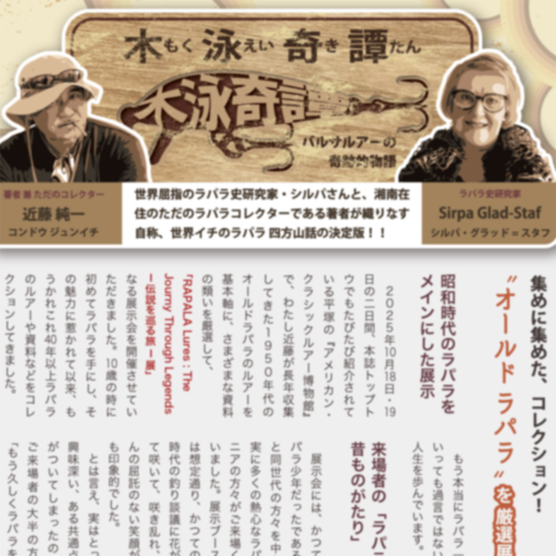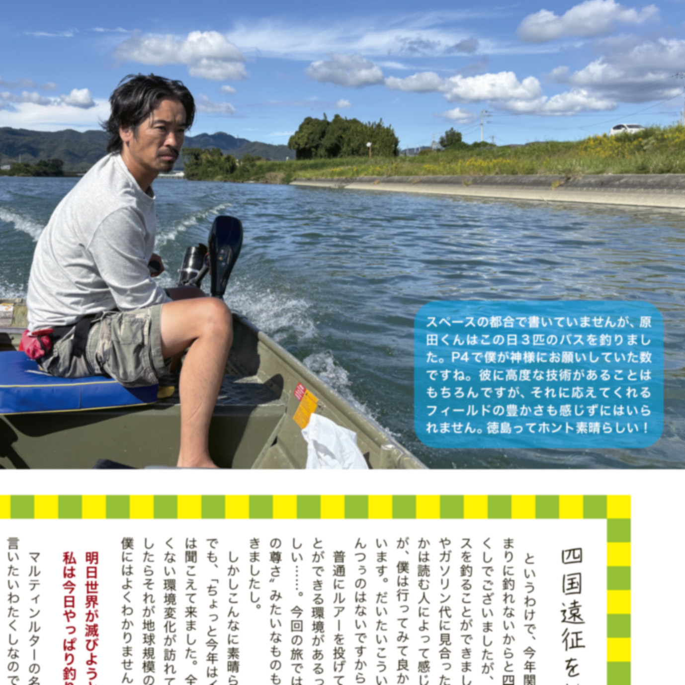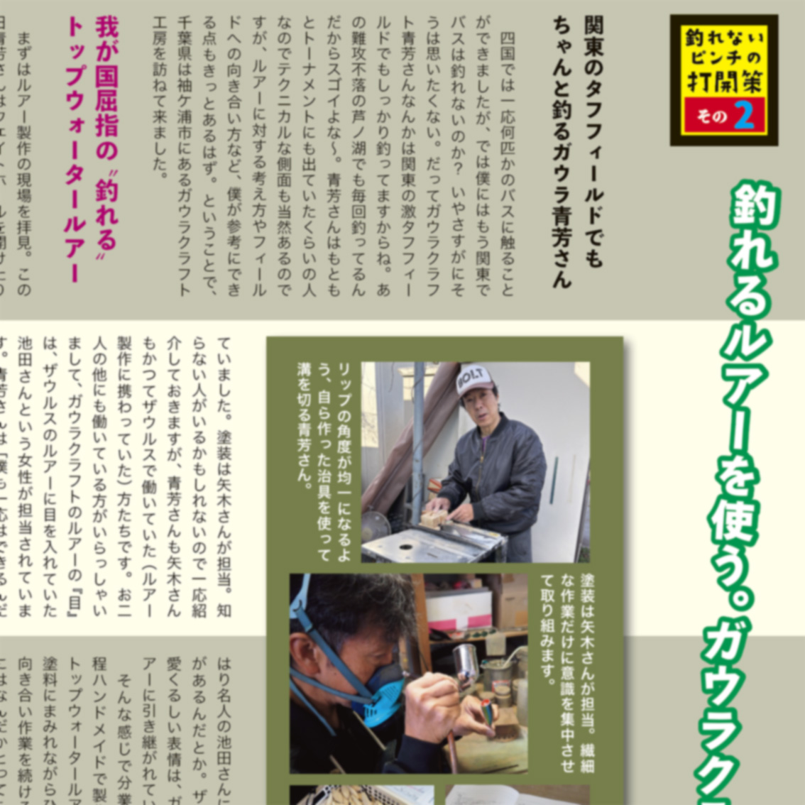 ピンチ。バスが釣れませんの。⇒釣れないなら釣れそうなところに行ってみる〈四国の釣り人・釣り場レポート〉⇒釣れるルアーを使う。ガウラクラフトという選択肢 など/毎年恒例のワーゲンイベント/ラパラコレクター近藤純一さんの新連載『木泳奇譚』/道具愛『J,A, COXE Model.15』/現代ルアーThinking『徳島で活動するルアービルダーたち』/ガウラクラフト青芳さん『耳を澄まして自然の声を聞いてみよう』/イレクターズビンテージギアガイド『イレクターズキャンプ』/津波ルアーズ元木さん『プラッガーズ・アングル』/SpincastReels『トゥルーテンパーUNI-SPIN 63SL』/箱道『ズイール・アマゾン・ウエストボックス』/ギタリスト和泉聡志さん『プレイギター・オア・ダイ! ゴーフィッシング・オア・ダイ!』/釣りの帰りの寄り道グルメ/バスポンド、河口湖にお引っ越し!/TOMOTUNE『アベイルのパーツのみで組み上げたアベイル2501C』/COMMONOS『大人の本気チャビング』『大人の本気ガサガサ』/マニアのお宅を拝見!/アイデアは愛である/第57回霞ヶ浦クリーン作戦 53pic-up/ムチョウワークス関さんのルアー製作講座『全部もってけ!』/八百板浩司さんの画集出版記念個展レポート/党首のひとりごと/党員名簿 ほか